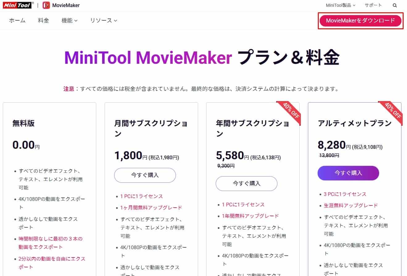 MiniTool MovieMakerプランの料金と機能比較