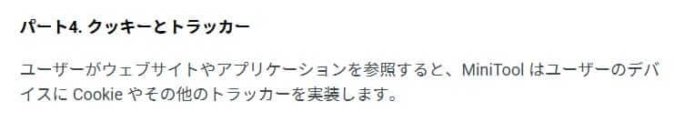 MiniToolのプライバシーポリシー(公式サイトで確認可能)によると、ユーザーデータ(デバイス情報、使用状況、IPアドレスなど)を収集する場合があると記載されています。これは、製品改善やマーケティング目的で一般的なソフトウェア会社が行う標準的なデータ収集の一環です。