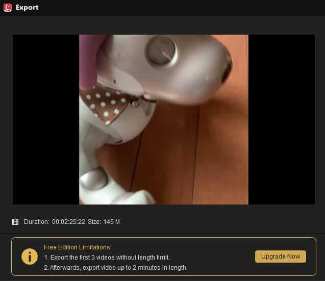 もしもっと長い動画を何本も書き出したい場合は、右下の「**Upgrade Now(今すぐアップグレード)」**ボタンから有料版にする必要があるよ、という意味です🐾